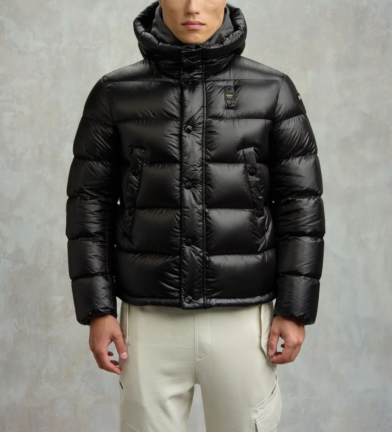 Piumino trapuntato a righe orizzontali ed interno in contrasto colore. Capo iconico Blauer con imbottitura naturale in piuma, calda e non ingombrante.