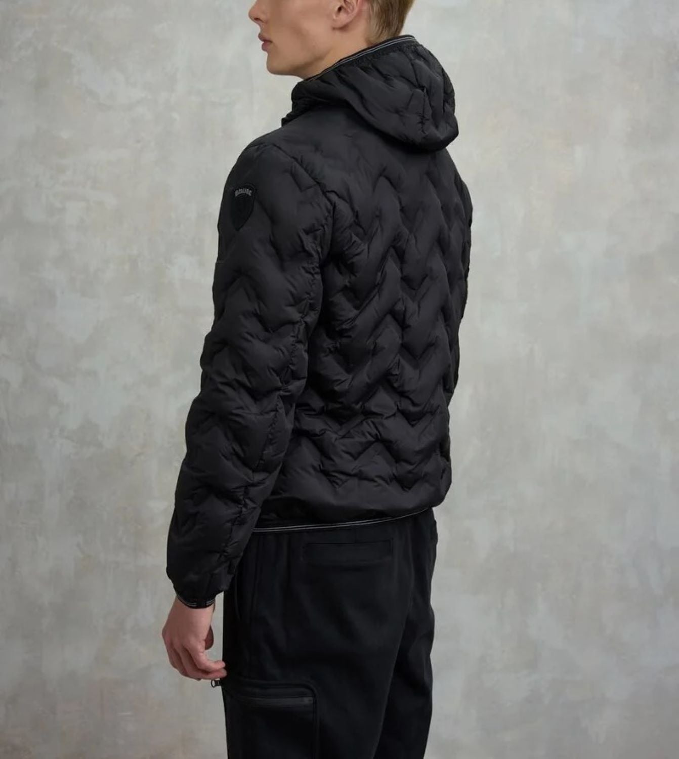 Piumino con cappuccio fisso e profilo dall’aspetto aderente e increspato. Cuciture nastrate ad angoli che dona un tocco innovativo e dinamico.