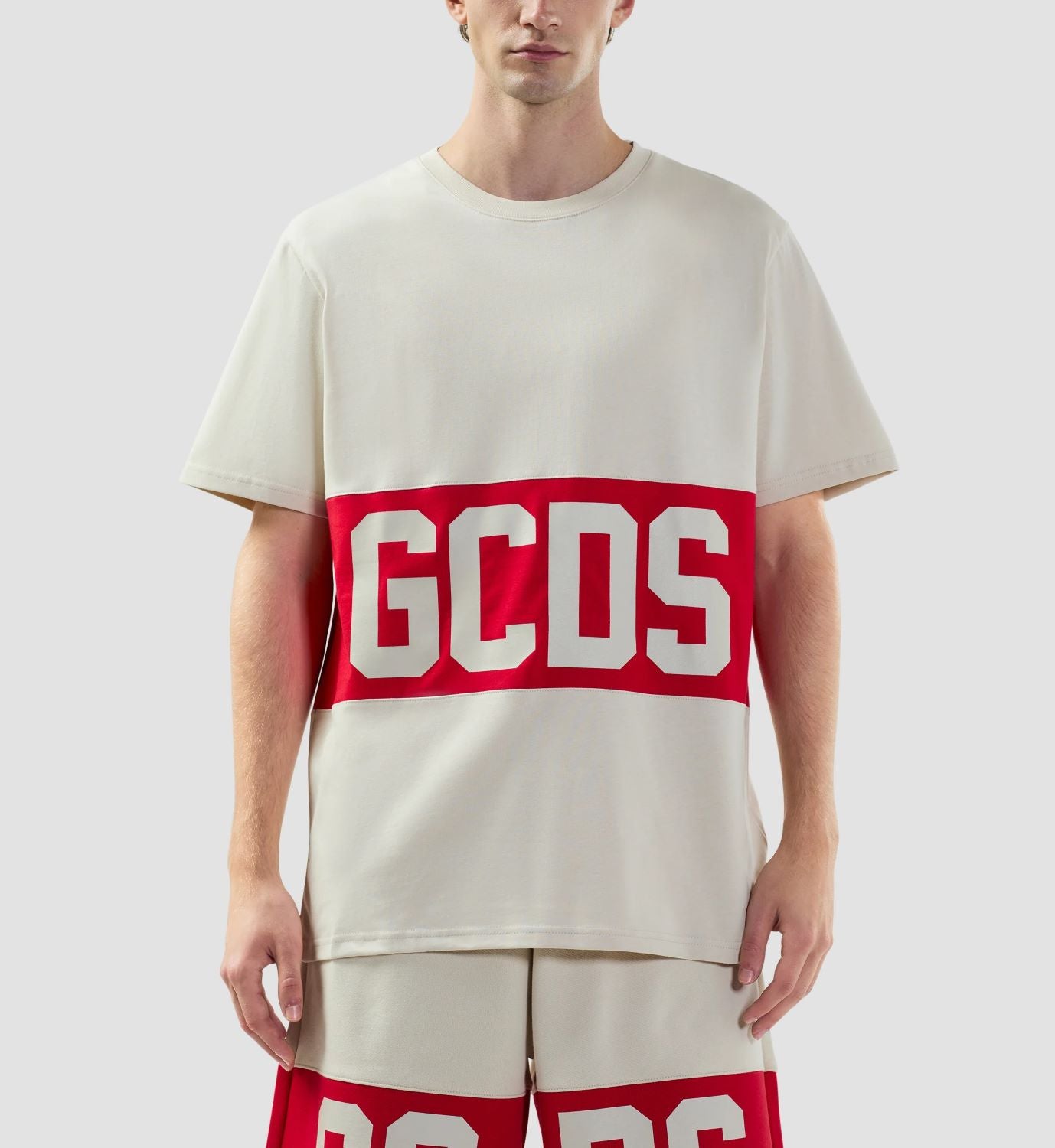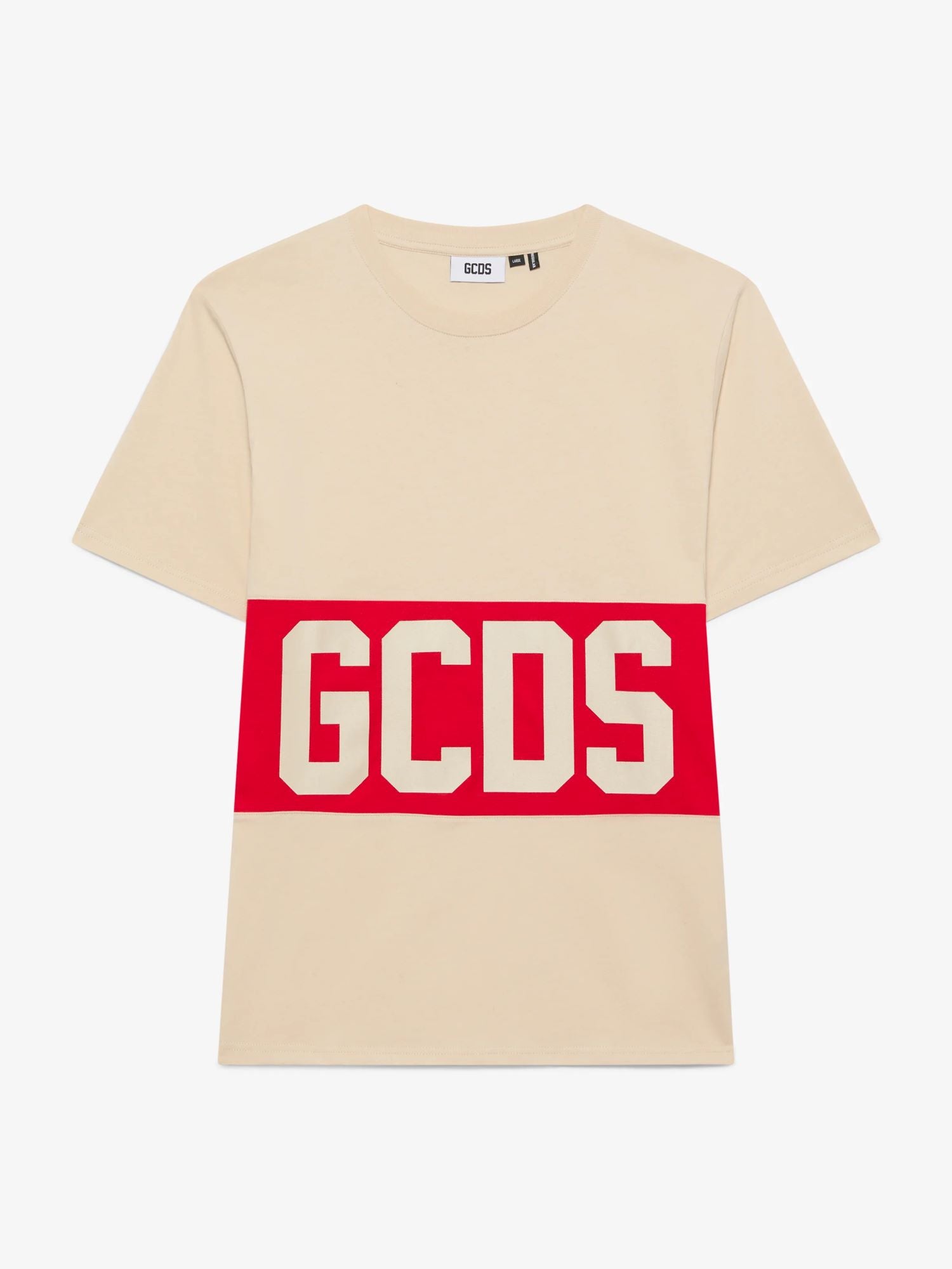- T-shirt in jersey di cotone pesante con banda GCDS serigrafata a contrasto sul petto e sul retro. Collo a costine e cuciture rinforzate. Vestibilità regular.