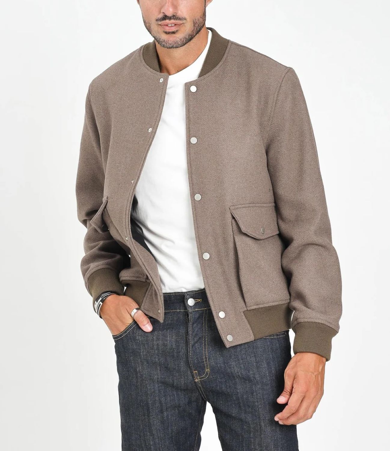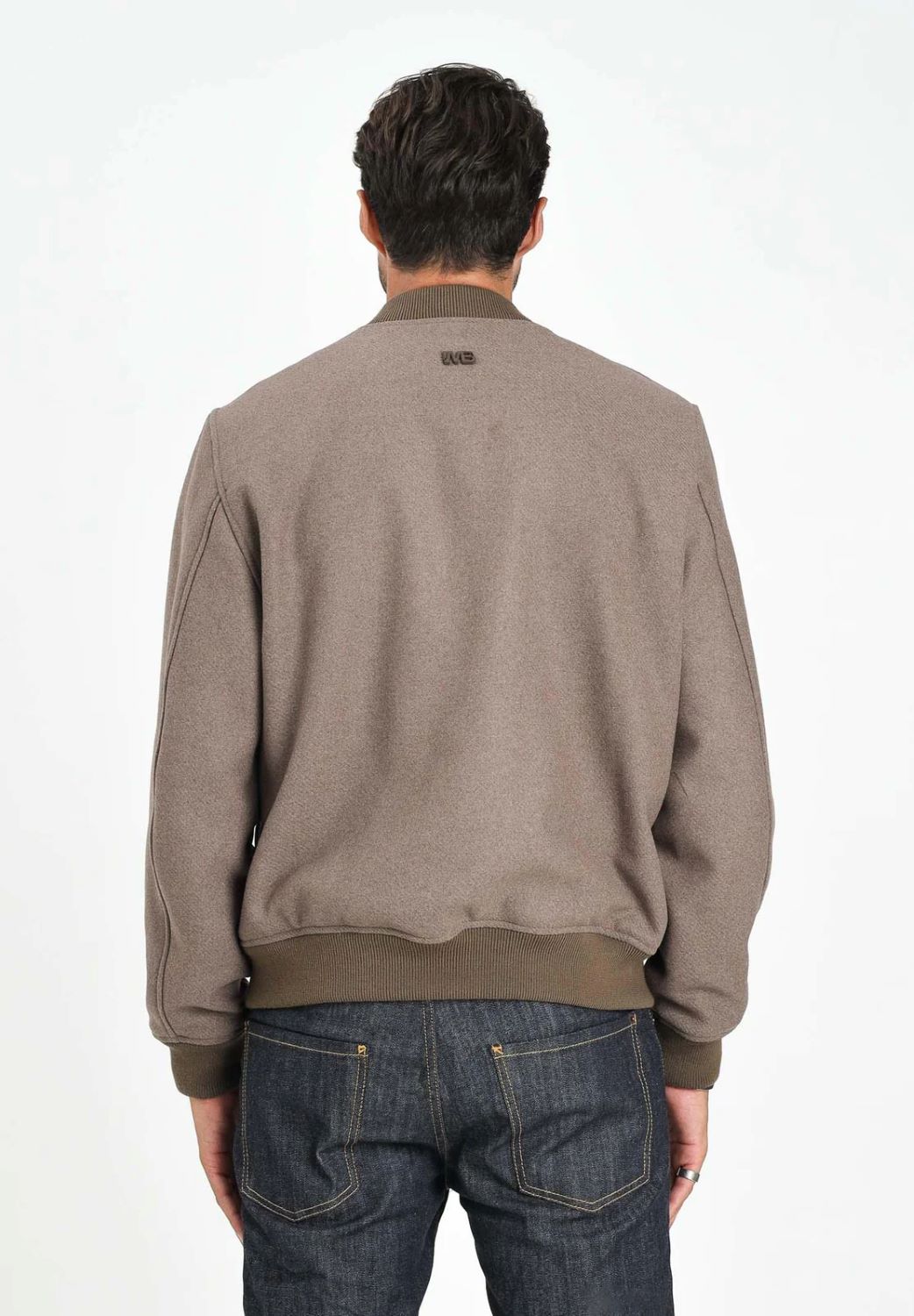 - I'M BRIAN Bomber tortora da uomo. Questo giubbotto si ispira al classico bomber college americano, rivisitato in chiave minimal ed elegante. Realizzato in tessuto strutturato, presenta una chiusura frontale con bottoni a pressione metallici e un colletto a costine stile varsity, che si abbina a polsini e fondo elastico per una vestibilità confortevole. Il design è essenziale, ma arricchito da due ampie tasche frontali con patta e bottone, che uniscono funzionalità e stile. Sul retro, sotto il collo, è presente una piccola scritta tono su tono che aggiunge un dettaglio discreto ma distintivo.