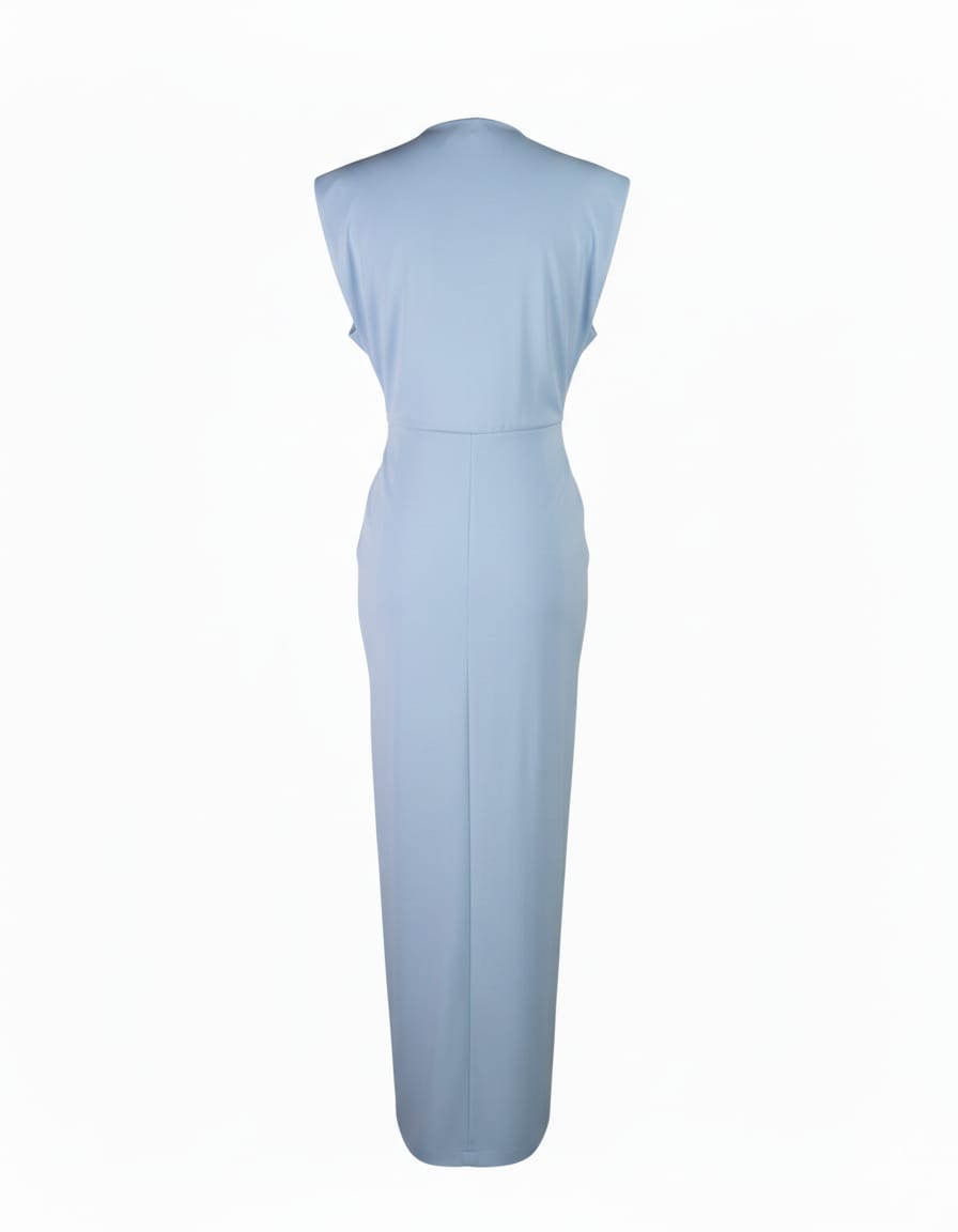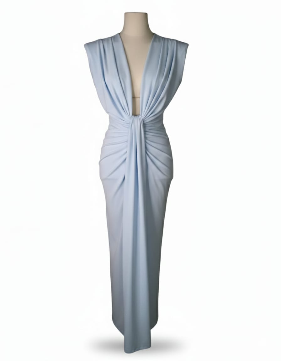 L'azzurro cielo è la tonalità perfetta per chi cerca un'alternativa sofisticata ai classici neutri. Questo abito è ideale per matrimoni primaverili, eventi estivi o serate speciali dove vuoi distinguerti con eleganza fresca e contemporanea. Il drappeggio centrale crea un punto focale che valorizza la figura mentre la lunghezza maxi conferisce un'allure da passerella.