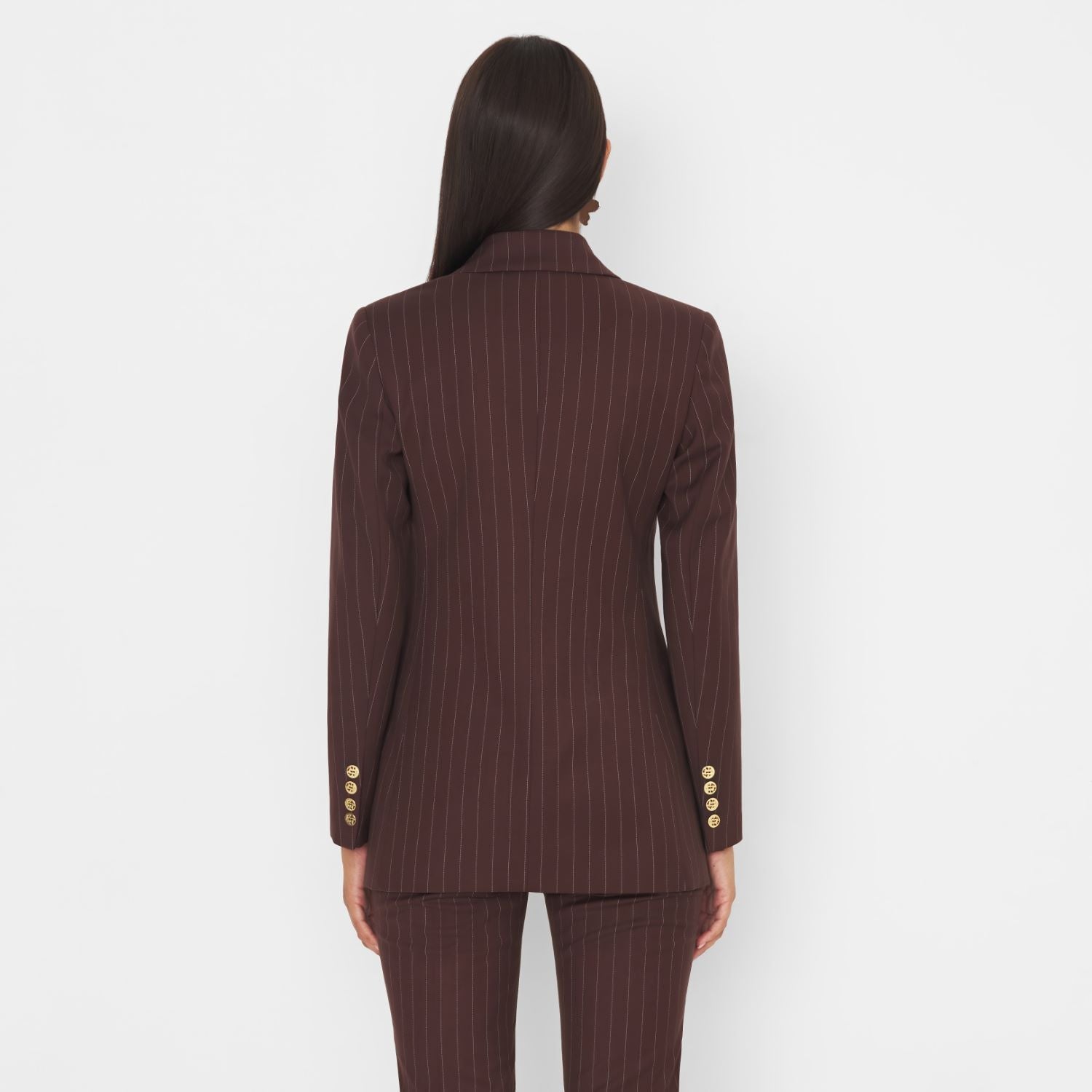 - Stripe Blazer è un capo elegante e dallo stile formale e professionale. Chiusura doppiopetto con sei bottoni dorati, taglio sartoriale, con rever a lancia e spalle strutturate mette in risalto la silhouette. Dalla fantasia gessata slancia la figura e dona un tocco classico. Nel complesso, è una giacca sofisticata, perfetta per occasioni formali, eventi business o per un look da ufficio deciso e chic.