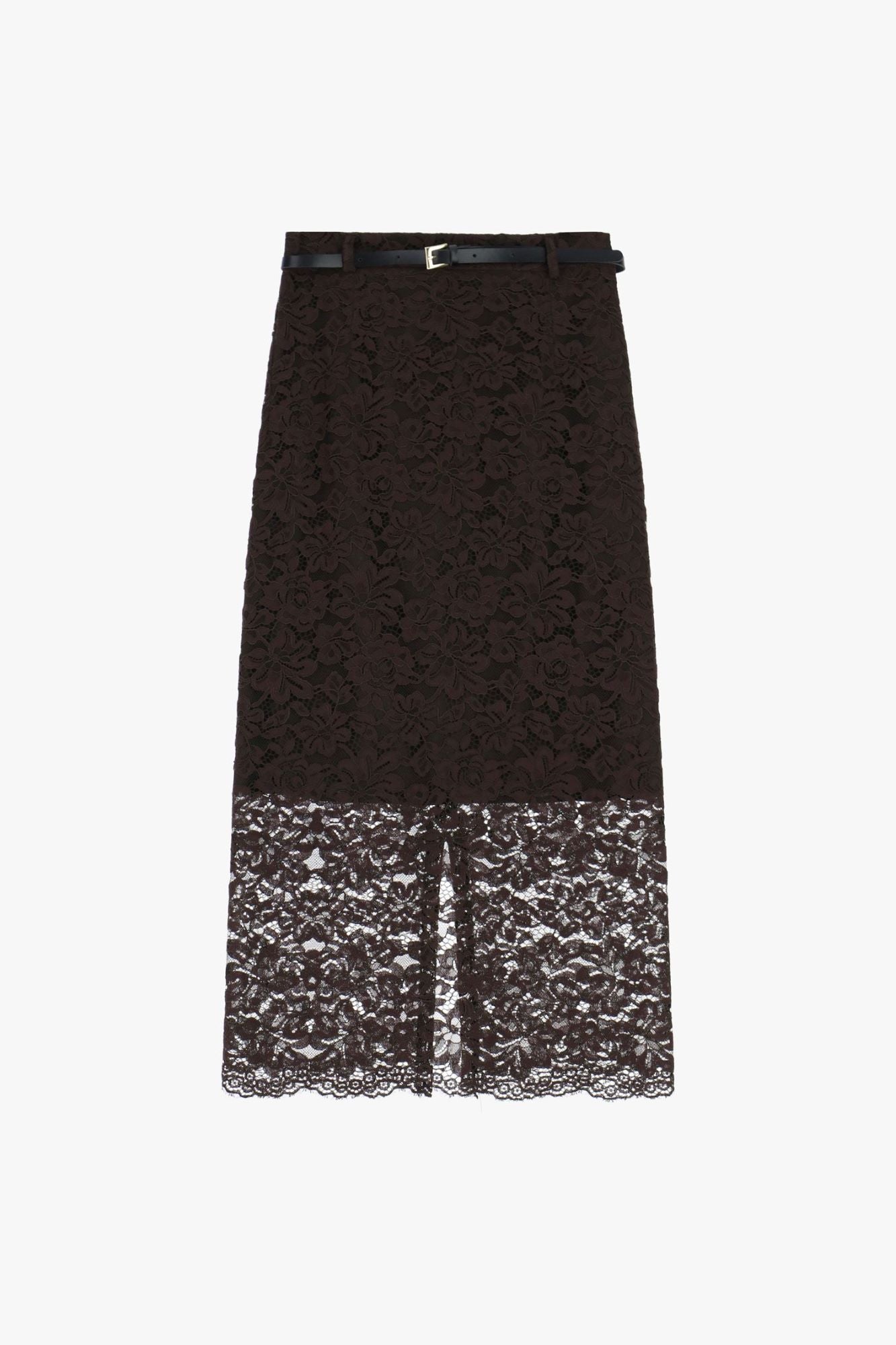- Gonna lunga caratterizzata da una raffinata lavorazione in pizzo floreale, rifinita con un elegante spacco frontale e dettagliata da una cintura sottile con fibbia metallica. Perfetta per creare look sofisticati e distintivi, permette di valorizzare l’individualità attraverso la combinazione con top e accessori contemporanei.