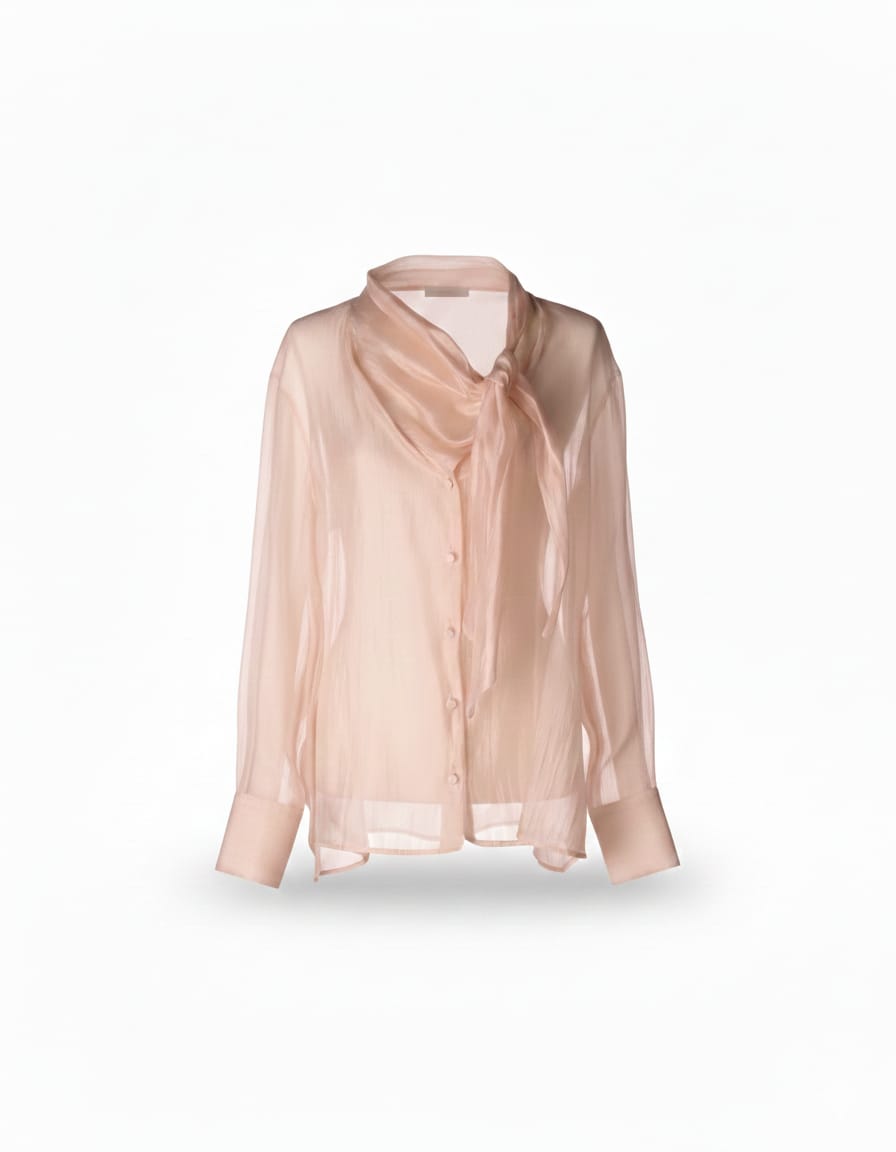 Sensualità eterea e raffinatezza contemporanea si fondono in questa camicia IMPERIAL in delicato rosa cipria. Un capo che ridefinisce la femminilità attraverso trasparenze sofisticate e linee essenziali.