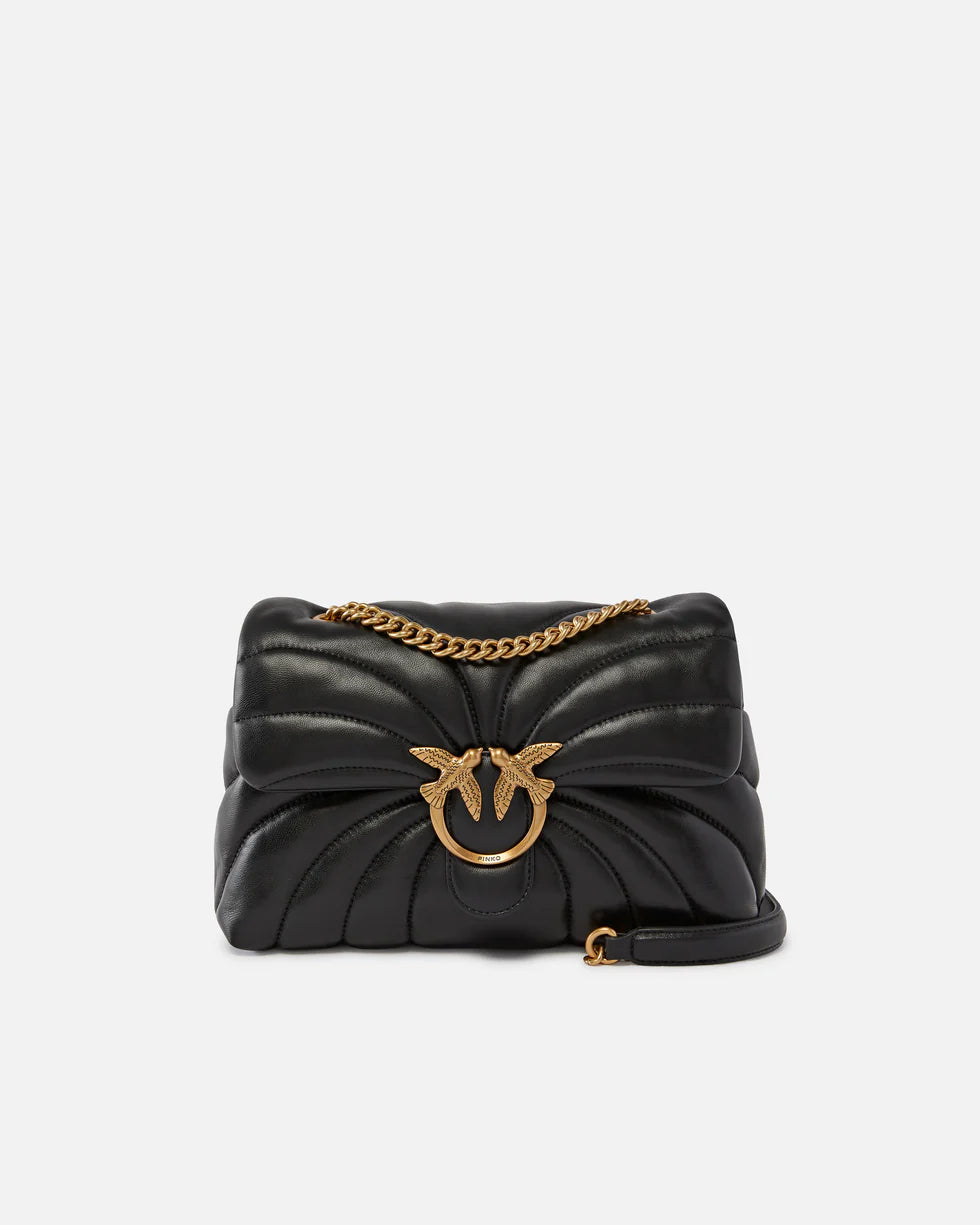 Scopri l'essenza dell'eleganza italiana con questa raffinata borsa PINKO della collezione Primavera/Estate 2026. Il nero profondo si fonde armoniosamente con i preziosi dettagli antique gold, creando un accessorio che celebra il lusso contemporaneo con un tocco vintage.