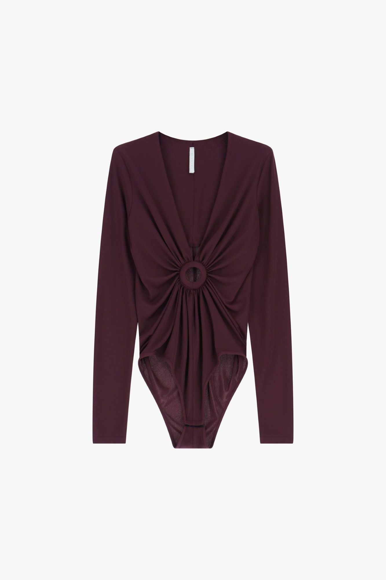 • Body caratterizzato da un profondo scollo a v e maniche lunghe, arricchito da un dettaglio anello centrale che crea un raffinato effetto drappeggiato. Una scelta distintiva per chi ricerca una silhouette valorizzata e dettagli di tendenza, facile da abbinare sia con pantaloni sartoriali che con gonne dalla linea pulita.