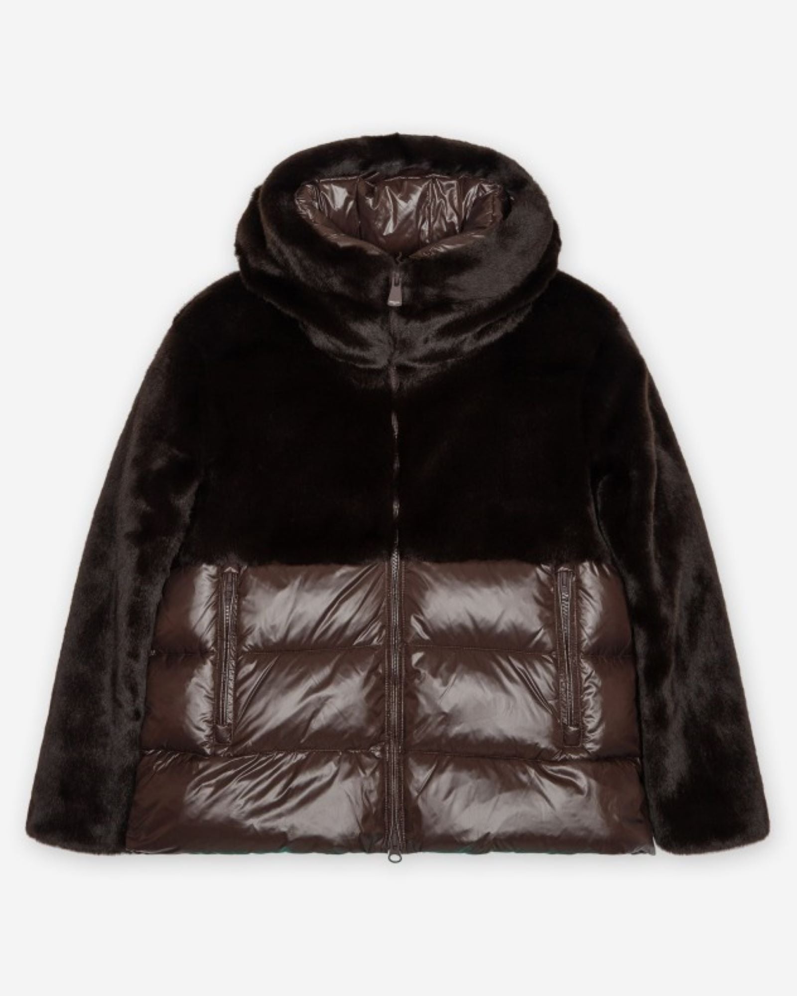 Giubbetto in ecopelliccia nella parte superiore e in nylon lucido nella parte inferiore. Caldo cappuccio ed impuntura sotto a righe orizzontali; capo pensato per proteggere dagli inverni più rigidi senza rinunciare allo stile.