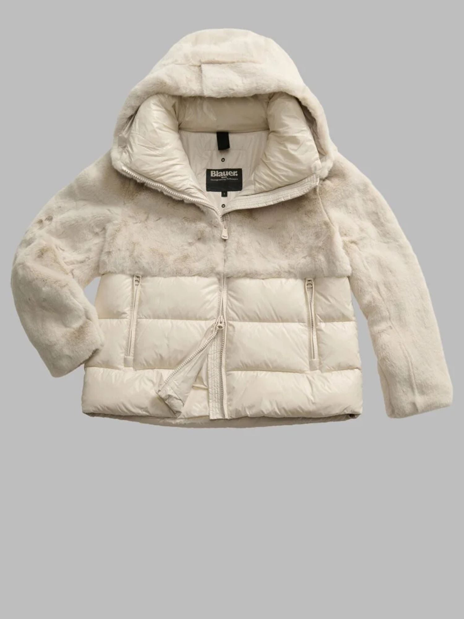 Giubbetto in ecopelliccia nella parte superiore e in nylon lucido nella parte inferiore. Caldo cappuccio ed impuntura sotto a righe orizzontali; capo pensato per proteggere dagli inverni più rigidi senza rinunciare allo stile.