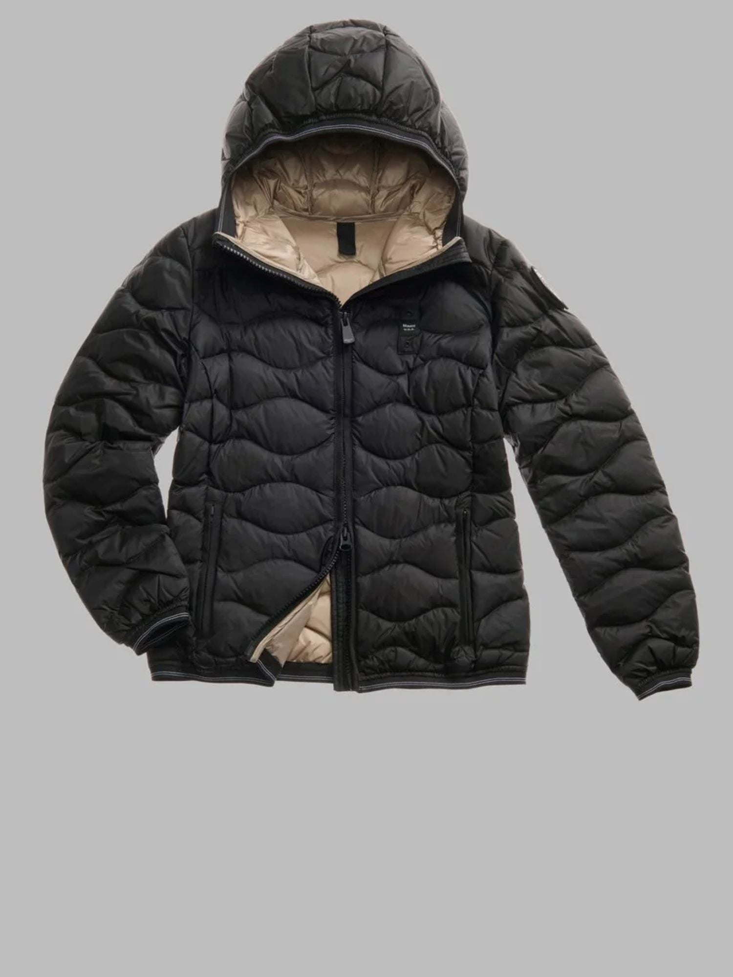 Piumino idrorepellente trapuntato ad onde orizzontali dal taglio svasato. Capo iconico Blauer con imbottitura naturale, calda e non ingombrante.