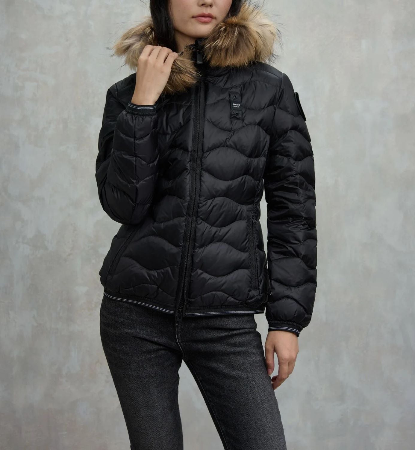 Piumino idrorepellente trapuntato ad onde orizzontali e con profilo del cappuccio in vera piuma. Capo iconico Blauer con imbottitura naturale, calda e non ingombrante, per essere sempre alla moda.