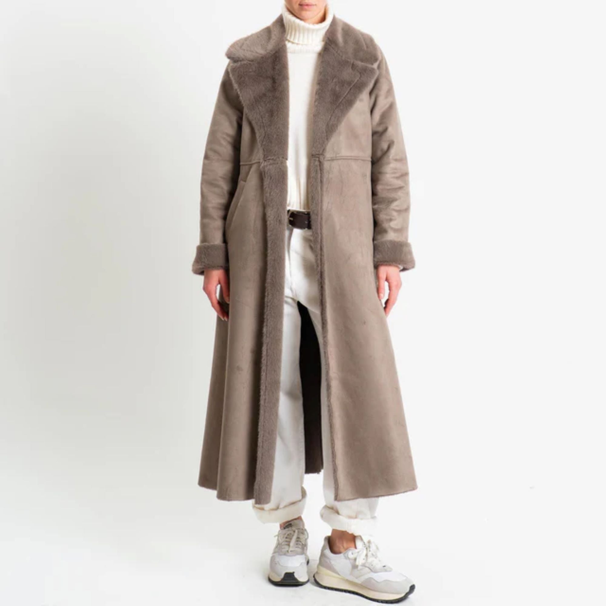 - Collo ampio rivestito in pelliccia ecologica morbida color tortora