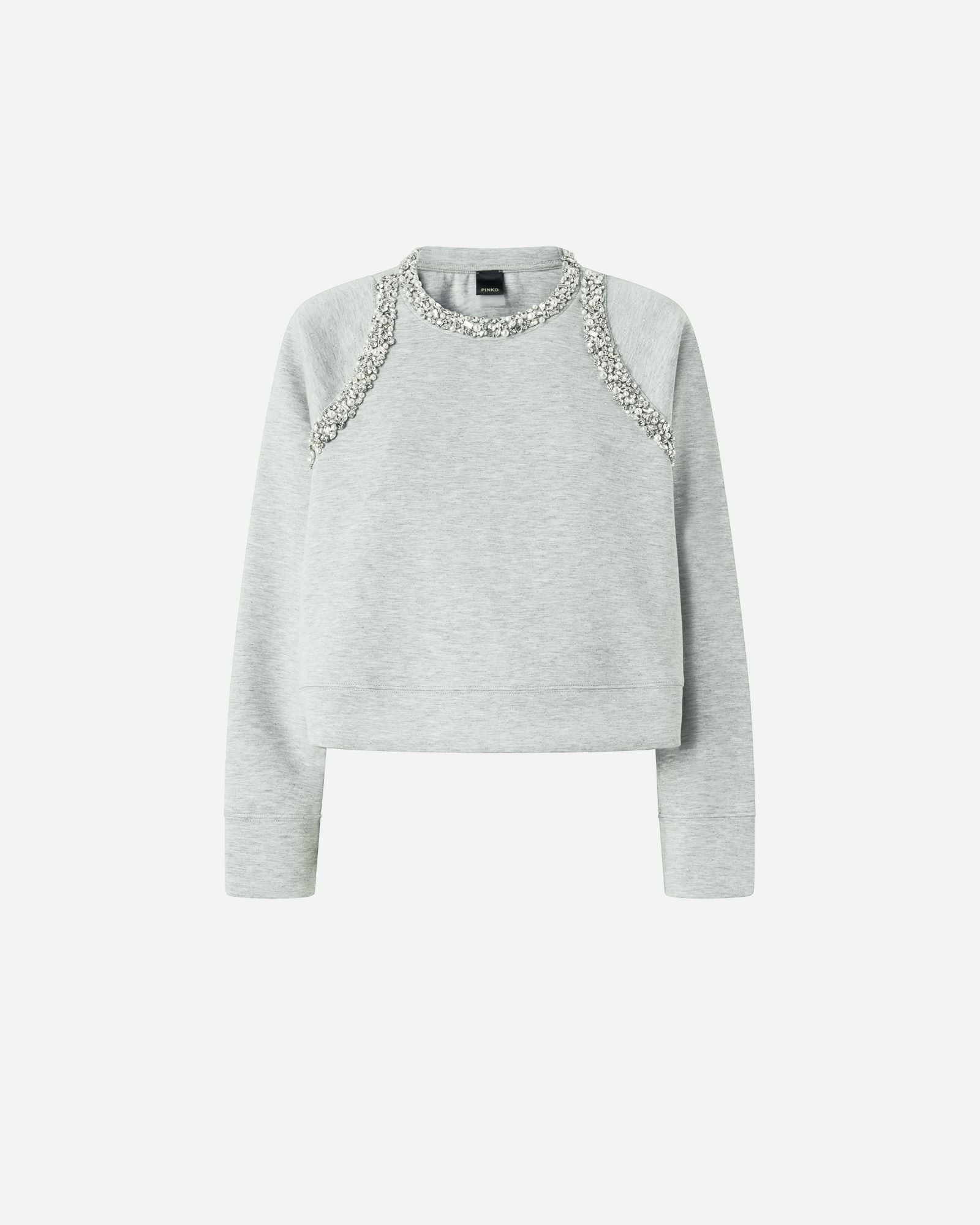 - Felpa casual da donna in jersey accoppiato di misto cotone stretch, un tessuto leggero ed elastico dalla superficie semilucida. Sulla parte frontale del collo e del taglio raglan delle maniche è presente una ricca decorazione gioiello realizzata a mano che si compone di cristalli di diversa forma e misura e di perle irregolari dall'aspetto naturale. Indossala con i tuoi jeans preferiti per avere un outfit femminile e scintillante.
